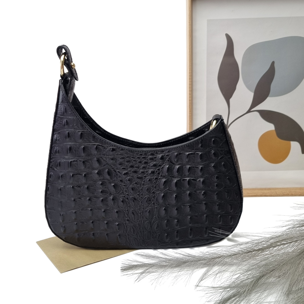 Сумочка крос-боді в середньому розмірі, текстура шкіри не однорідна, виготовлена під рептилію. Має одне основне відділення на блискавці та додаткову внутрішню кишеню на блискавці. У комплекті є два плечові шкіряні ремені на карабінах: один — короткий, другий — довгий, він не регулюється.